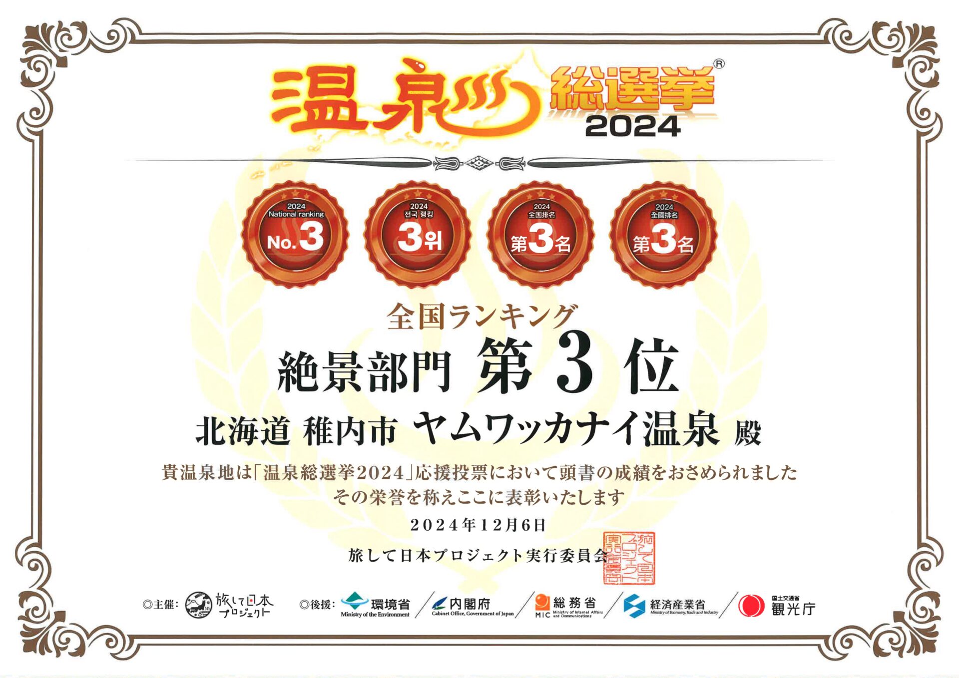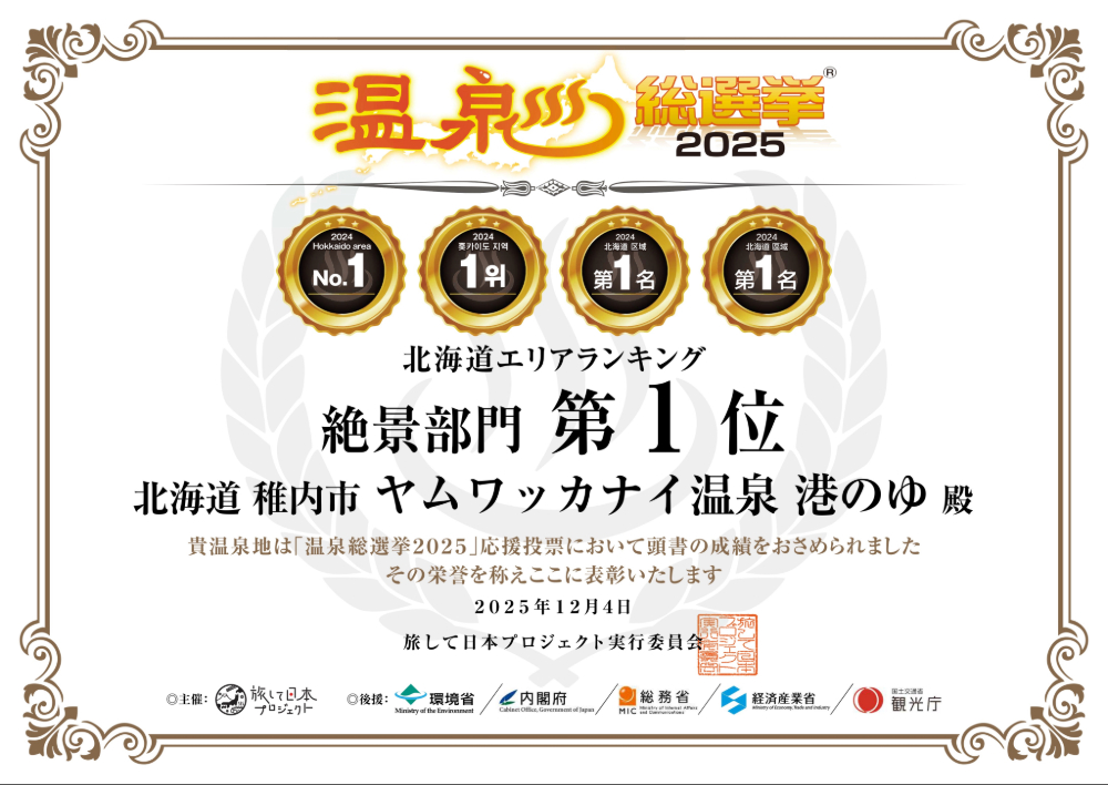 温泉総選挙2025 絶景部門北海道エリア1位 全国4位