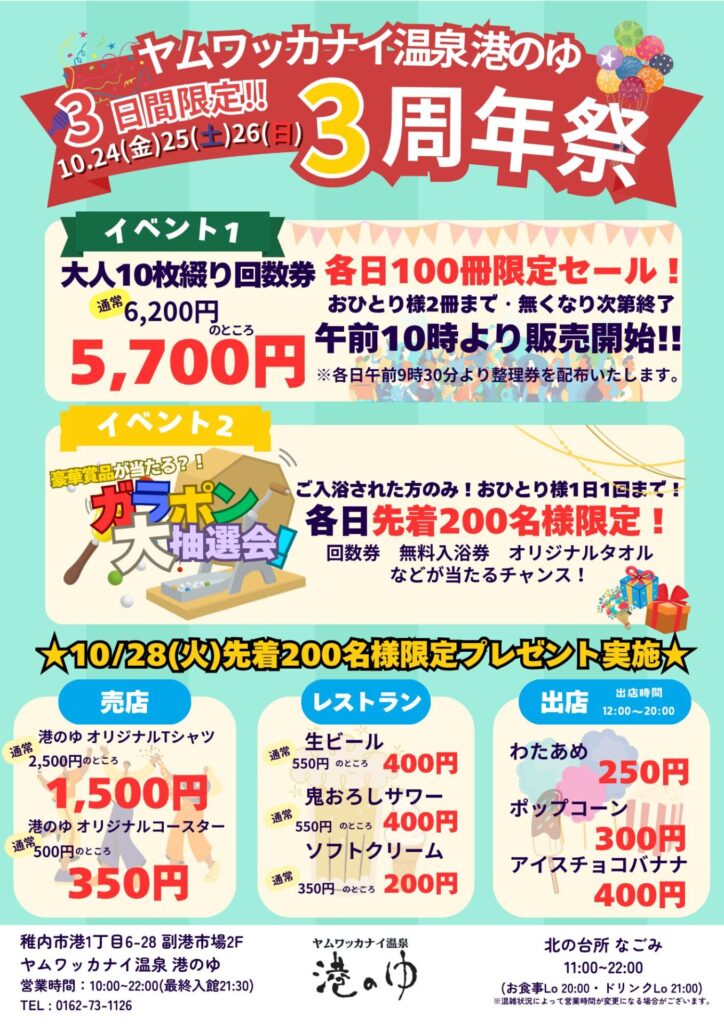 おかげさまで3周年!!今年もやります周年祭 投稿日 2025年10月4日 更新日 2025年10月5日 著者 minatonoyu カテゴリー お知らせ 10月24日・25日・26日の3日間はイベント盛りだくさん!!その他にイベント2は3日間以外に10月28日も先着200名様に豪華景品が当たるガラポン抽選会ご来店お待ちしております♪