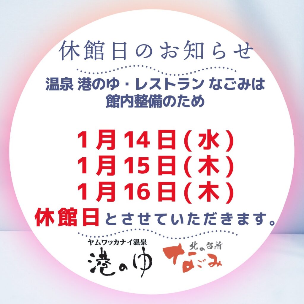 1月の港のゆ・なごみ休館日のお知らせ 投稿日 2025年12月31日 著者 minatonoyu カテゴリー お知らせ 1月の港のゆ・なごみ休館日のお知らせ1月14日・15日・16日の3日間は館内点検の為、お休みいたします。17日からは通常営業になりますのでご来館お待ちしております。