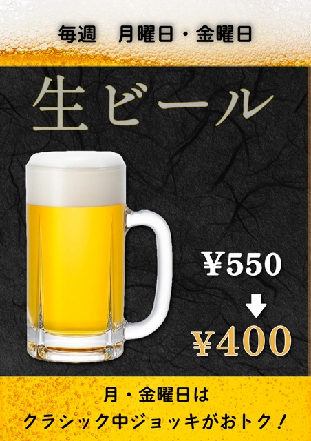 1月毎週月曜日・金曜日は生ビールイベント 投稿日 2026年1月1日 著者 minatonoyu カテゴリー お知らせ 毎週月曜日と金曜日は生ビールが安い生ビールが1杯400円で飲めちゃいます。通常価格は550円です。お風呂上りやサウナ上りに一杯いかがですか?ザンギや・焼き鳥・枝豆のおつまみと一緒にいかがですか?1月は5日からになります。