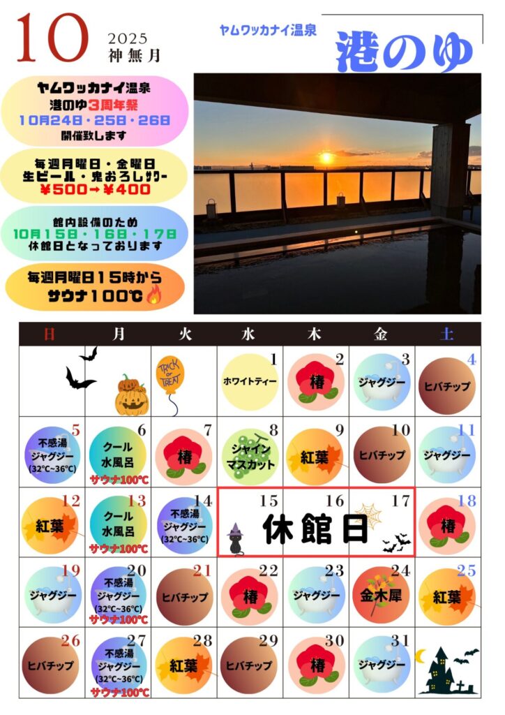 10月のイベントや日替わり湯スケジュール 投稿日 2025年9月29日 更新日 2025年9月30日 著者 minatonoyu カテゴリー お知らせ 10月のイベントや日替わり湯スケジュール10月は不感湯や紅葉、椿、マスカットの湯10月は毎週月曜日がサウナ100℃day 熱々サウナをお楽しみください。