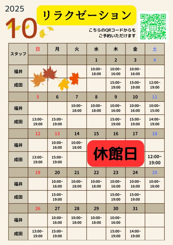 10月リラクゼーションスケジュール 投稿日 2025年9月29日 著者 minatonoyu カテゴリー お知らせ 10月リラクゼーションスケジュールお仕事頑張ったご褒美や心身共にリフレッシュしたいなぁと思ったら温泉入ってからのリラクゼーション温活で心も体もリフレッシュしませんか?ネット予約も受付しておりますのでご希望のお客様は下記の予約サイトからご予約いただけます。