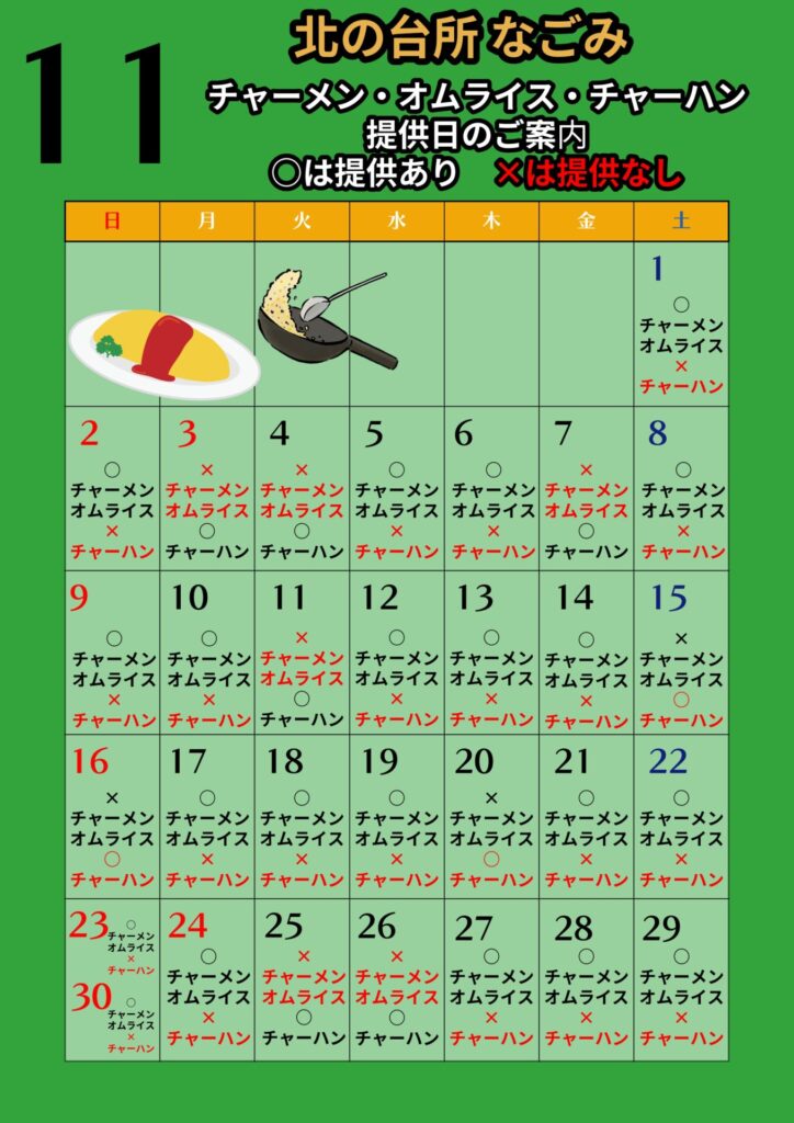 11月料理提供についてのお知らせ 投稿日 2025年11月1日 著者 minatonoyu カテゴリー お知らせ 11月料理提供についてのお知らせ下記の日は、チャーメンとオムライスの提供を中止しております。チャーメン・オムライスご提供できない日はチャーハンをご提供しております。