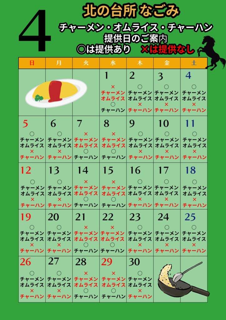 4月料理提供についてのお知らせ 投稿日 2026年4月1日 著者 minatonoyu カテゴリー お知らせ 4月料理提供についてのお知らせ添付ポスターに記載されている日は、チャーメンとオムライスの提供を中止しております。チャーメン・オムライスご提供できない日はチャーハンをご提供しております。